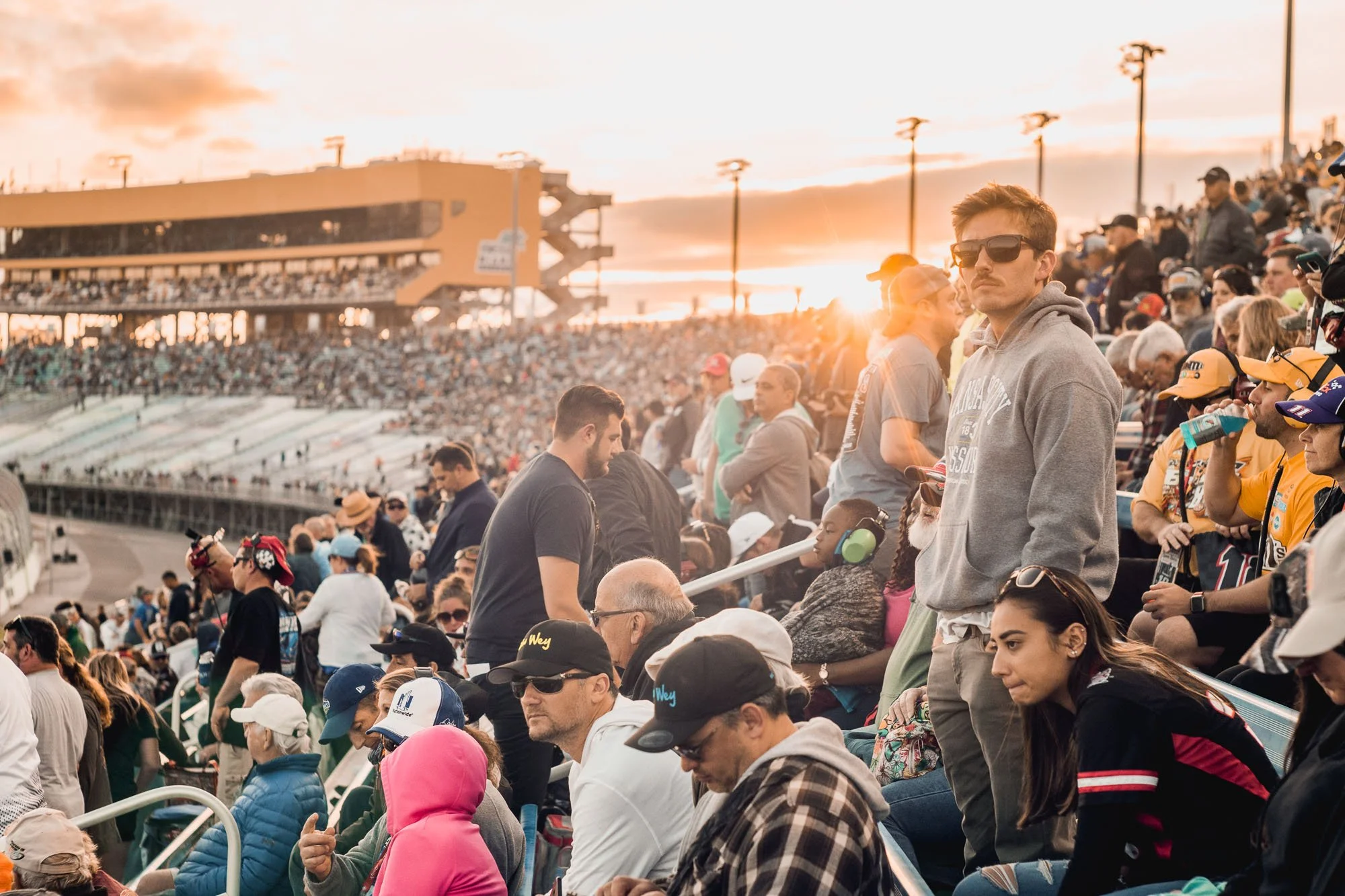 Crowd of spectators at a racing event during sunset, with people sitting and standing in stadium stands.